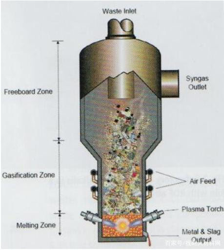 相比傳統(tǒng)燃燒技術(shù),等離子體技術(shù)通過對空氣進(jìn)行電離,在千分之一秒內(nèi)溫度可達(dá)3000℃~10000℃,有毒物質(zhì)在高溫下快速裂解,因而不會產(chǎn)生二噁英,危險(xiǎn)氣體和重金屬在等離子爐中處理后能實(shí)現(xiàn)無害化。當(dāng)垃圾投入到等離子體氣化爐中后(如圖1),有機(jī)垃圾在爐中,迅速脫水、熱解、裂解,產(chǎn)生以H2、CO和部分有機(jī)氣體等為主要成份的混合可燃性氣體,再經(jīng)過二次燃燒達(dá)到減容化、無害化。無機(jī)物(金屬、玻璃等)在等離子體高溫作用下熔融,達(dá)到了減容目的。等離子體技術(shù)與傳統(tǒng)燃燒技術(shù)相比,對危險(xiǎn)廢物處理得更加徹底,產(chǎn)生的尾渣呈結(jié)晶態(tài),其組成為無危險(xiǎn)物,可用于建筑材料,無需填埋。經(jīng)過處理,垃圾質(zhì)量大量減少、有毒物質(zhì)裂解、焚燒灰形成玻璃渣,并且轉(zhuǎn)變?yōu)闊o害的材料,等離子技術(shù)處理高危廢物是危險(xiǎn)廢物處理的發(fā)展趨勢。