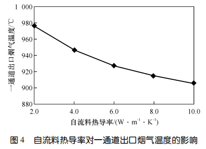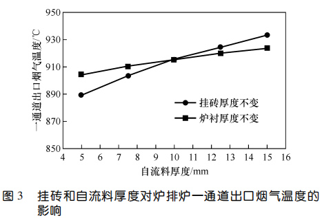 2、對(duì)于掛磚+自流料爐襯,掛磚厚度不變時(shí),自流料厚度越大,一通道出口煙氣溫度越高;爐襯總厚度不變時(shí),掛磚越厚、自流料層越薄,一通道出口煙氣溫度越低;爐襯各工作層厚度固定時(shí),一通道出口煙氣溫度隨自流料熱導(dǎo)率的升高而降低,通過(guò)調(diào)整自流料熱導(dǎo)率,一通道出口煙溫差值可達(dá) 70 ℃。