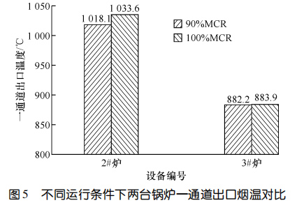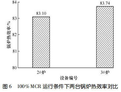兩臺(tái)設(shè)備運(yùn)行 11 個(gè)月后進(jìn)行了能效測(cè)試。圖5對(duì)比了 90%鍋爐大的連續(xù)蒸發(fā)量(簡(jiǎn)稱 MCR)和100%MCR 條件下鍋爐一通道的出口煙溫。圖6示出了100%MCR運(yùn)行條件下兩臺(tái)鍋爐熱效率的對(duì)比。結(jié)果顯示:在 90%MCR 運(yùn)行條件下,3#爐一通道出口煙溫比2#爐低 135.9 ℃,在100%MCR 運(yùn)行條件下,3#爐一通道出口煙溫比 2#爐低 149.7 ℃,3#爐的熱效率比 2#爐高 0.64%。相較而言,使用膜式壁爐襯的3#爐在負(fù)荷相當(dāng)?shù)那闆r下,余熱鍋爐熱效率更高。